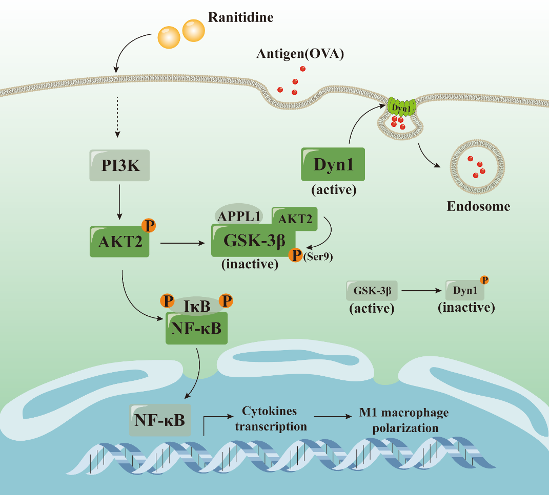 佐剂是疫苗中不可缺少的组成部分,但目前用于人类疫苗的佐剂很少。特别是在肿瘤疫苗的研究中,佐剂在开发中的有效性已经在许多研究论文中得到了体现,但临床上总是存在不良反应。因此,迫切需要开发更安全、更有效的肿瘤疫苗佐剂。开发安全有效的佐剂的一个重要方向是旧药的再利用。H2受体抑制剂已用于临床多年,其安全性是有保证的。在以往的研究中,H2受体抑制剂如西米替丁和尼扎替丁已被报道具有免疫激活功能,但其机制尚不清楚。因此,本研究以雷尼替丁(RAN)作为B16-OVA肿瘤疫苗的佐剂,探讨H2受体阻断剂RAN作为疫苗佐剂在调节巨噬细胞极化和激活CTL中的作用和机制,评价其对荷瘤小鼠的免疫保护作用。研究发现RAN可以激活PI3K-AKT2信号通路促进巨噬细胞向M1极化并增强巨噬细胞的内吞作用,同时通过AKT2来调节GSK-3β/Dymin1信号的反馈调来增强巨噬细胞的内吞作用。并且RAN作为佐剂可以抑制肿瘤生长,提高荷瘤小鼠生存率。M1的极化是抗肿瘤免疫的关键起点,最终通过增强Th1和CTL的功能来激活抗肿瘤免疫。这一新发现为RAN作为疫苗佐剂应用于抗肿瘤免疫防治奠定了理论和实验基础。